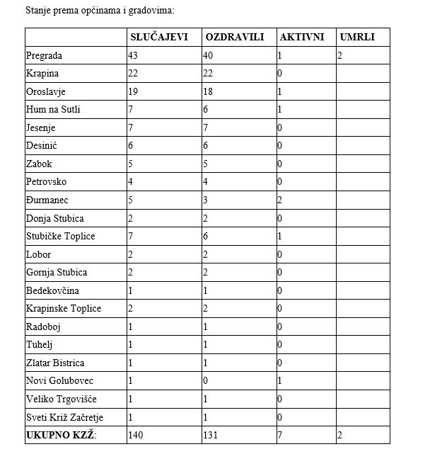 U nastavku je tablica sa statističkim podacima prema jedinicama lokalne samouprave: o broju stanovnika Krapinsko-zagorske županije koji su bili evidentirani kao zaraženi koronavirusom, podatke o broju stanovnika Krapinsko-zagorske županije koji su evidentirani kao ozdravljeni, podatke o broju preminulih te broju aktivnih slučajeva. U statistiku kontinuirano uključujemo i stanovnike Krapinsko-zagorske županije testirane izvan područja naše županije te osobe koje nisu imale pozitivan nalaz na koronavirus, no sukladno uputama, se zbog epidemiološke anmneze i kliničke slike vode kao pozitivne.