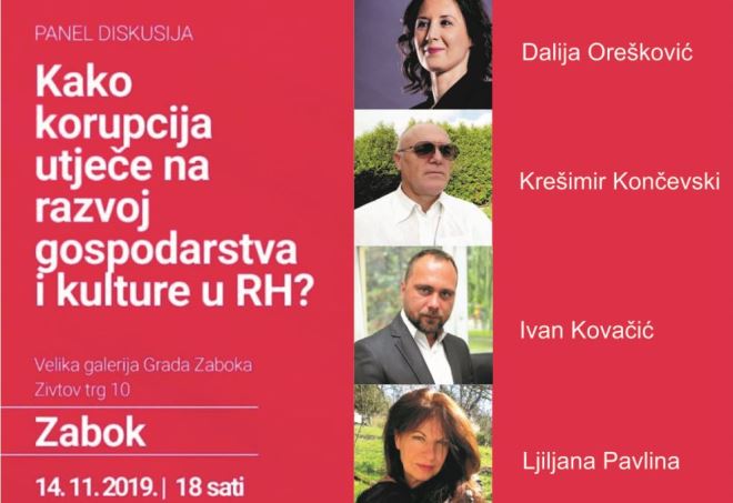 Ovog četvrtka, 14. studenoga 2019. godine, u Velikoj galeriji Grada Zaboka (Zivtov trg 10), s početkom u 18 sati, održat će se javna tribina, točnije, panel diskusija, na temu: „Kako korupcija utječe na razvoj gospodarstva i kulture u RH?