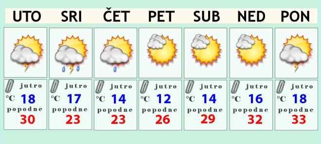 Sutra će u noći i ujutro biti pretežno oblačno, mjestimično s kišom. Danju djelomično sunčano, poslijepodne uz mogućnost za lokalni pljusak s grmljavinom. Vjetar slab do umjeren sjeverni i sjeverozapadni. Jutarnja temperatura od 14 do 18°C, a najviša dnevna od 24 do 26°C.