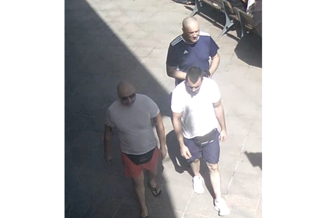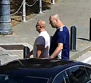 Prvi muškarac: visok oko 170-175 cm, jače tjelesne građe, obrijane glave, odjeven u bijelu majicu kratkih rukava, narančaste kratke hlače i sandale.