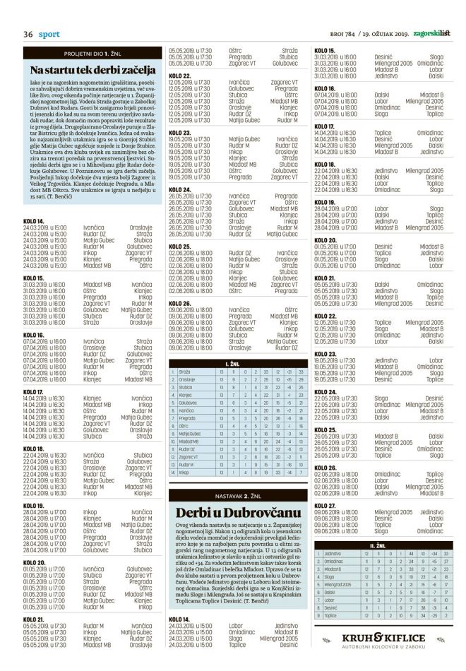 Ovog vikenda nastavlja se natjecanje u 2. Županijskoj nogometnoj ligi. Nakon 13 odigranih kola u jesenskom dijelu vodeća momčad je dojučerašnji prvoligaš Jedinstvo koje je na najboljem putu povratka u elitni zagorski rang nogometnog natjecanja. U 13 odigranih utakmica Jedinstvo je slavilo u njih 12 i ostvarilo gol razliku od +34. Za vodećim Jedinstvom kakav takav korak još drže Omladinac i belečka Mladost. Upravo će se ta dva kluba sastati u prvom proljetnom kolu u Dubrovčanu. Vodeće Jedinstvo gostuje u Loboru kod istoimenog domaćina. Susjedski derbi igra se u Konjščini između Sloge i Milengrada. Još se sastaju u Krapinskim Toplicama Toplice i Desinić.