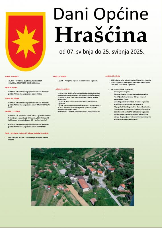 Od petka, 9. do nedjelje 11. svibnja pod šatorom na školskom igralištu priprema se zabava i druženje uz svirku glazbenih sastava Fiškali, Dinacordy Luna bend i Loop band. U nedjelju je u šprtskoj dvorani najavljen 3. Hrašćinski ženski futsal, kojega organiziraju Sportsko društvo Hrašćina, KUD Meteor i PŠ Hrašćina uz pokroviteljstvo KZŽ i Općine. Zainteresirane ženske ekipe trebaju se prijaviti organizatorima do 10. svibnja do 20 sati, kotizacije nema, a samo natjecanje počinje u nedjelju u podne. 9. Hrašćinski ASTRO u organizaciji Kluba ljubitelja zavičajne baštine Hrašćina održat će se 17. i 18. svibnja, a središnji dio proslave Dana Općine od 23. do 25. svibnja.