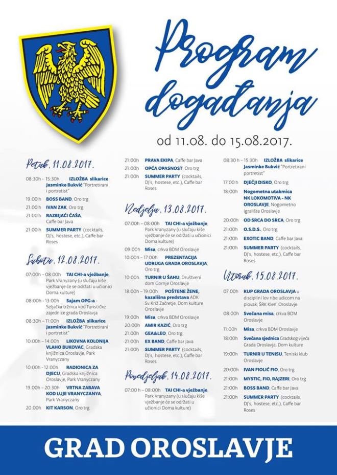 Vjerujemo da ljubitelji sporta neće propustiti nogometnu utakmicu između NK Lokomotive i NK Oroslavje na nogometnom igralištu koja će se održati u ponedjeljak 14.8. u 18 sati. U nedjelju će na Oro trgu nastupiti bendovi 'Od srca do srca' i O.S.D.S. Na sam blagdan Velike Gospe, u utorak 15. 8. će se u crkvi Blažene Djevice Marije u 11 sati održati sveta misa, u 18 sati će se održati svečana sjednica Gradskog vijeća. Na Oro trgu će nastupiti Ivan Fiolić Fio, Mystic bend, Rajzeri.