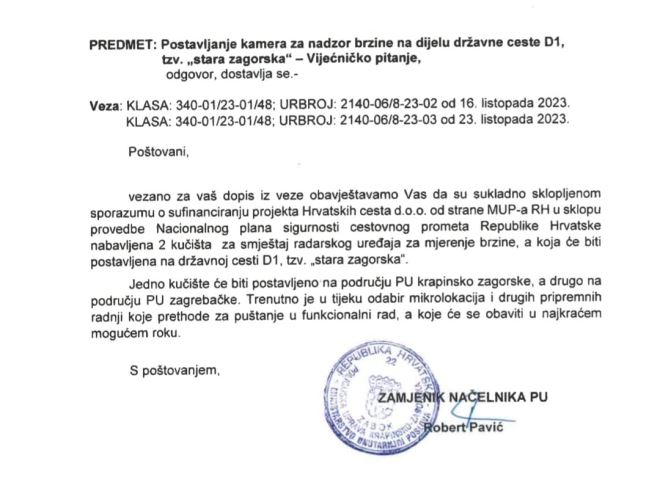 I upravo danas Šimunić je objavio presliku odgovora kojeg je dobio od zamjenika načelnika Policijske uprave krapinsko - zagorske, Roberta Pavića, a u kojem policija potvrđuje da na spornu cestu stižu dvije kamere s radarom. Jedna na područje PU krapinsko - zagorske, a druga na području PU zagrebačke. -Trenutno je u tijeku odabir mikrolokacija i drugih pripremnih radnji koje prethode za puštanje u funkcionalni rad, a koje će se obaviti u najkraćem mogućem roku - napisao je, između ostalog, Pavić.