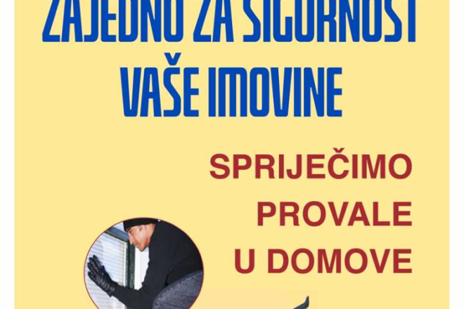 Provalnici vrlo dobro znaju kada u vašem domu nema nikoga. Dok se vi nalazite na radnom mjestu, obavljate druge poslove, nalazite se u kupovini, provalnici se mogu nalaziti u vašem domu. Kako ne bi postali žrtve ovih kaznenih djela građanima savjetujemo uvijek zaključavajte ulazna vrata, bez obzira na to koliko dugo ćete biti odsutni, ne zaboravite na balkonska i stražnja vrata, vodite računa da ste zatvorili i sve prozore,budite dodatno oprezni ako stvarate buku koja onemogućava da čujete posjetitelje (uključen usisavač, mikser, sušilo za kosu, glasno slušanje glazbe …) ili ste u udaljenim dijelovima kuće ili dvorišta (tavan, podrum vrt …),neposredno uz kuću ne ostavljate predmete koji omogućavaju lakše penjanje, poput ljestava ili sanduka,vanjski dio kuće, prilaz kući osvijetlite senzorskim svjetiljkama što će zlonamjernika omesti u nakani, ključ kuće, stana, vikend kuće ne ostavljate ispod otirača, u posudama za cvijeće ili na drugom lako dostupnom mjestu. Na obiteljskim kućama česte su mete lopova prozori, velike staklene površine na vratima i sl., pa ugradite dodatnu zaštitu poglavito na stražnjim stranama objekta koji su manje vidljivi.