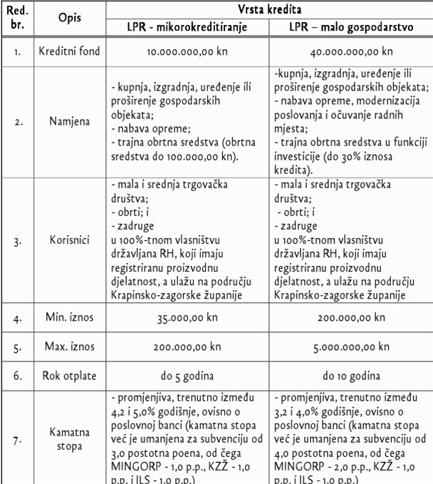 Riječ je o projektima „Lokalni projekti razvoja malog gospodarstva“ za 2009. godinu (LPR-MG) i „Lokalni projekti razvoja – mikrokreditiranje“ (LPR-MK). Predviđena subvencija kamata po LPR-MG iznosi 4 postotna poena (2 p.p. MINGORP, 1 p.p. KZŽ i 1 p.p. JLS), a po LPR-MK 3 postotna poena (1 p.p. MINGORP, 1 p.p. KZŽ i 1 p.p. JLS).