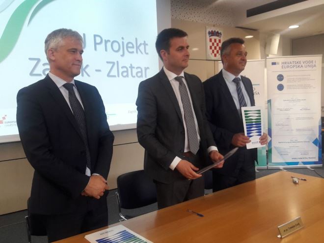Ugovore o financiranju te dodjeli bespovratnih sredstava za projekt Izgradnja sustava prikupljanja i odvodnje otpadnih voda sustava odvodnje Zabok i sustava odvodnje Zlatar potpisali su danas ministar zaštite okoliša i energetike dr. sc. Tomislav Ćorić, generalni direktor Hrvatskih voda mr. sc. Zoran Đuroković i direktor Zagorskog vodovoda d.o.o. Mario Mihovilić.
