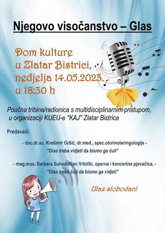 Kulturno umjetničko-edukacijska udruga "Kaj" iz Zlatar Bistrice priprema u nedjelju poučnu tribinu s multidisciplinarnim pristupom pod nazivom "Njegovo visočanstvo – Glas". Glas je alat koji se, neovisno o trendu sve manjeg vokalnog komuniciranja, još uvelike koristi, a elementaran je kod mnogih profesija, pa tako i većem broju Kaj-evaca. Na pitanja - kako sačuvati "dobar glas", kontrolirati "trošenje" glasnica, prepoznati poteškoće s glasom i na vrijeme ih osvijestiti, kako ga pravilno postaviti i iz njega svjesno i pametno izvući ono najbolje, te na mnoga druga, odgovore će dati dr. Krešimir Gršić, specijalist otorinolaringologije te operna i koncertna pjevačica Barbara Suhodolčan Vrbički. Tribina će se održati u Domu kulture u Zlatar Bistrici, u nedjelju od 18.30 sati, ulaz slobodan.