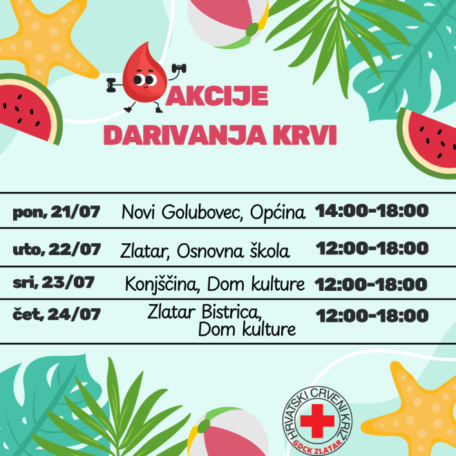 U ponedjeljak, 21. srpnja, humanitarna akcija dobrovoljnog darivanja krvi bit će u Novom Golubovcu, od 14 do 18 sati, u zgradi općine. U utorak, 22. srpnja, krv će se moći darovati u Osnovnoj školi Ante Kovačića Zlatar, od 12 do 18 sati.