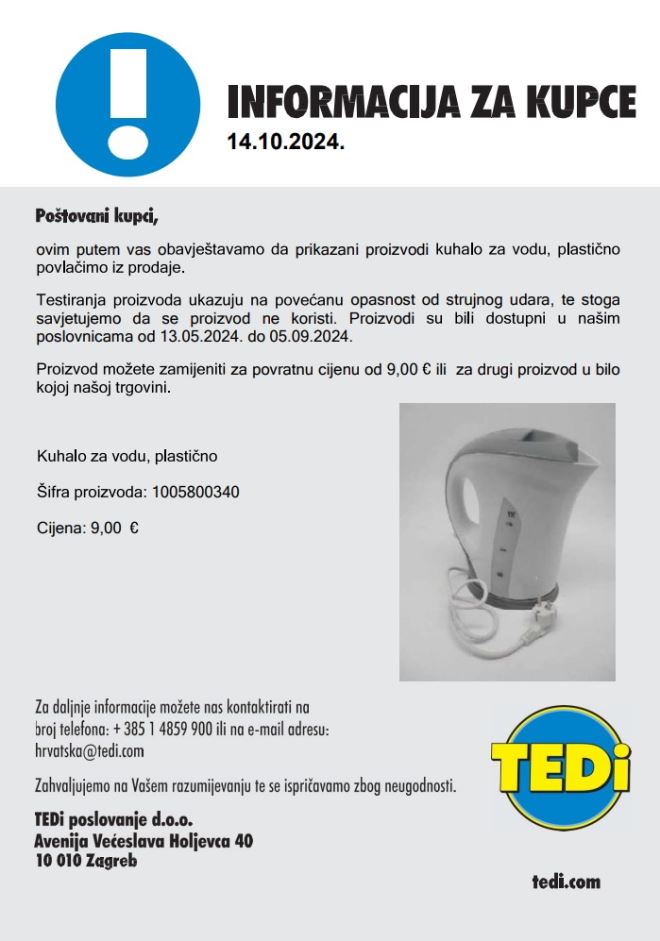 Trgovački lanac Tedi obavijestio je kupce kako povlači iz prodaje plastično kuhalo za vodu.