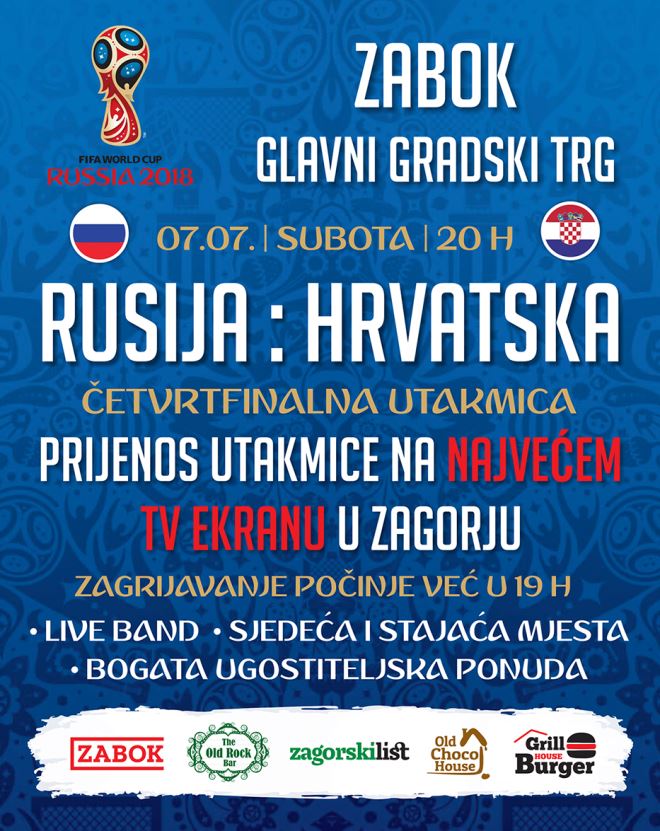 U organizaciji Grada Zaboka, The Old Rock bara, Zagorskog lista, Old Choco Housea i Grill & Burger Housea u subotu 7. srpnja se na glavnom zabočkom trgu organizira gledanje prijenosa četvrtfinalne utakmice između Hrvatske i Rusije. Prijenos počinje u 20 sati, a zagrijavanje na trgu počinje već u 19 sati. – Pratite utakmicu na najvećem tv ekranu u Zagorju – poručuju organizatori.