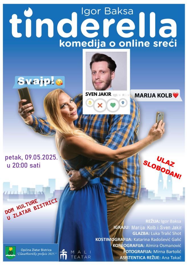 U sklopu Zlatarbistričkog proljeća u Domu kulture u Zlatar Bistrici, u petak 09.05.2025. godine s početkom u 20 sati odigrat će se predstava ”Tinedrella” – komedija o online sreći, u izvedbi Malog teatra.