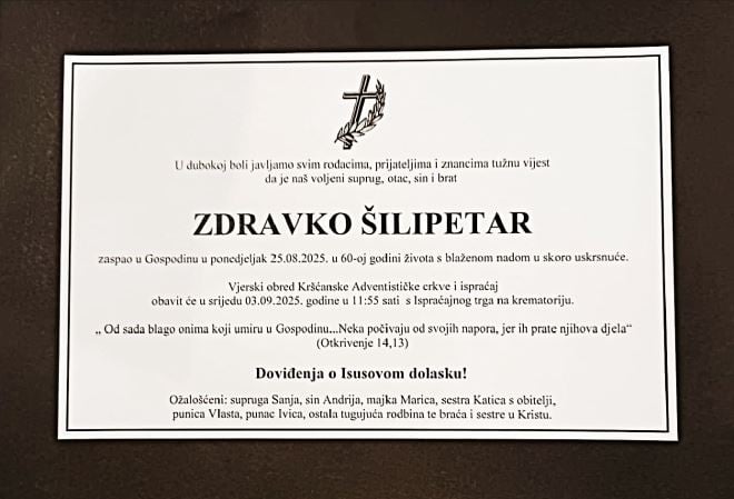 Dana 25.8.2025. u Kliničkoj bolnici Sveti Duh nakon duge i teške bolesti prestalo je kucati srce oca, supruga, Muža zagorskog srca, vatrogasca, humanista, čovjeka i prijatelja – Zdravka Šilipetra.