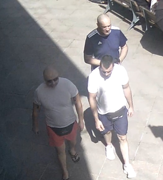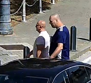 Prvi muškarac: visok oko 170-175 cm, jače tjelesne građe, obrijane glave, odjeven u bijelu majicu kratkih rukava, narančaste kratke hlače i sandale.