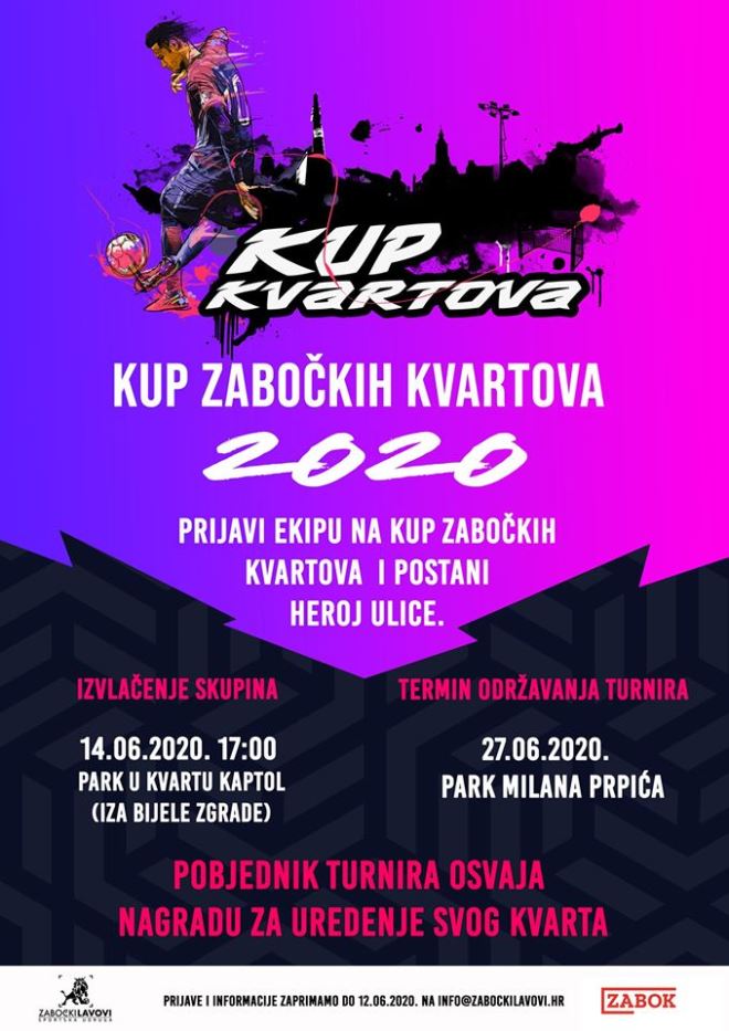 Sportska udruga Zabočki lavovi druge godine zaredom organizira Kup zabočkih kvartova koji će se održati u subotu 27. lipnja. Izvlačenje skupina održat će se u nedjelju 14. lipnja u 17 sati u parku u kvartu Kaptol (iza bijele zgrade kod suda). Pobjednik i ove godine osvaja nagradu za uređenje svog kvarta. Prijave i sve informacije zaprimaju se do 12. 06. na [email protected].