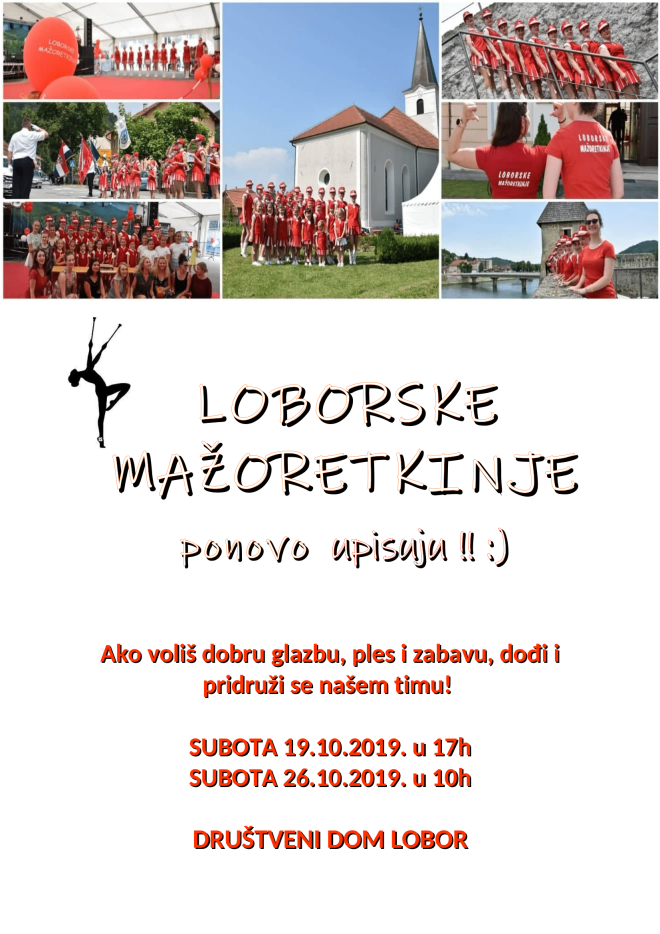Iz Loborskih mažoretkinja pozivaju sve djevojčice i djevojke od 4 do 20 godina da im pridruže. Upisi novih članica održat će se naredne dvije subote, 19. listopada od 17 sati i 26. listopada od 10 sati u Društvenom domu Lobor. - Osim redovnih treninga mogu očekivati dobru zabavu, puno dobre glazbe, novih prijateljstava, poznanstava i putovanja, jer mažoretkinje su način života – pozvala je predsjednica Loborskih mažoretkinja Nataša Brlečić.