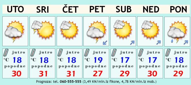 Međutim, uz povremeno umjeren ili jači razvoj oblaka postojat će mogućnost da ponegdje naiđe neki kratkotrajan pljusak s grmljavinom ili kraći nalet kiše. Ništa dugotrajno, ništa obilno, ali imajte na umu ako planirate kakve aktivnosti ili radove na otvorenom. Ta mogućnost uglavnom postoji kasno popodne ili navečer kad je energije i topline najviše. Temperatura zraka ostaje između 27 i 30 Celzijevih stupnjeva, samo u slučaju pljuska malo svježije.