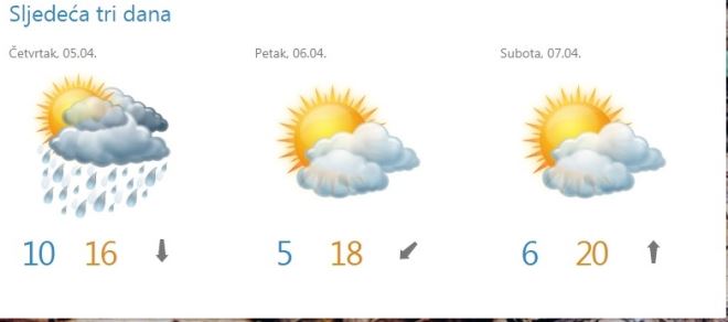 Danas vjetrovito uz dosta oblaka. Puhat će jak jugozapadni vjetar. Dan će proći suho ili uz ponegdje alu šansu za par kapi kiše. Jutarnja temperatura oko 10, a najviša dnevna od 16 do 20 Celzijevih stupnjeva. Sutra promjenjivo uz mogućnost za kišu ili kratkotrajne pljuskove. Vjetar slab do umjeren jugozapadni. Jutarnja temperatura od 8 do 11, a najviša dnevna od 15 do 18 Celzijevih stupnjeva, javlja prognostičar Kristijan Božarov.