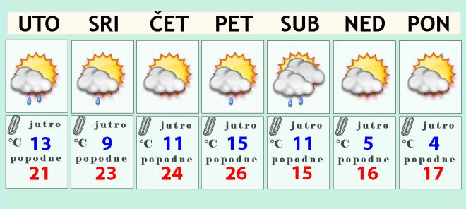 Pad temperature se očekuje u subotu. To će biti oblačniji i hladniji dan uz pojačan sjeverni vjetar i mjestimičnu kišu. Temperatura zraka će cijeli dan biti između 10 i 15 Celzijevih stupnjeva.