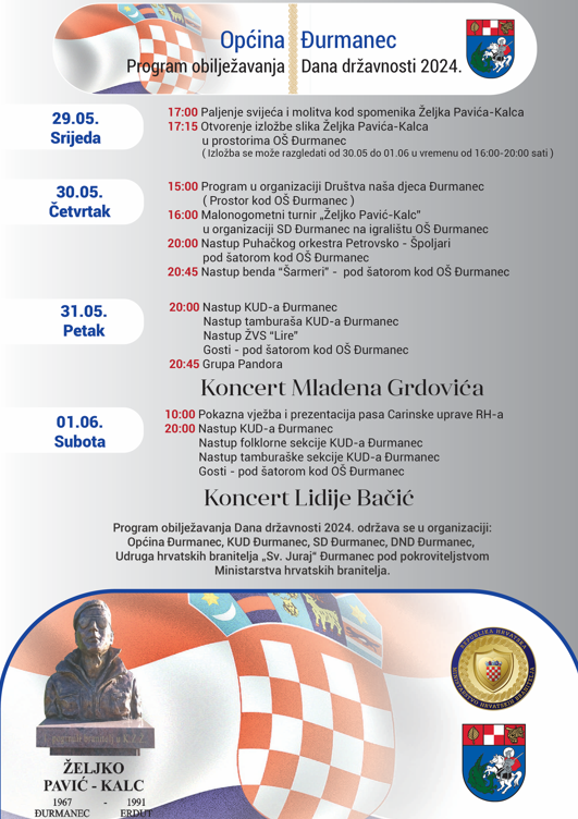 U organizaciji Općine Đurmanec a pod pokroviteljstvom Ministarstva hrvatskih branitelja nizom događaja od srijede do subote, od 29.05. do 01.06., obilježit će se Dan državnosti.
