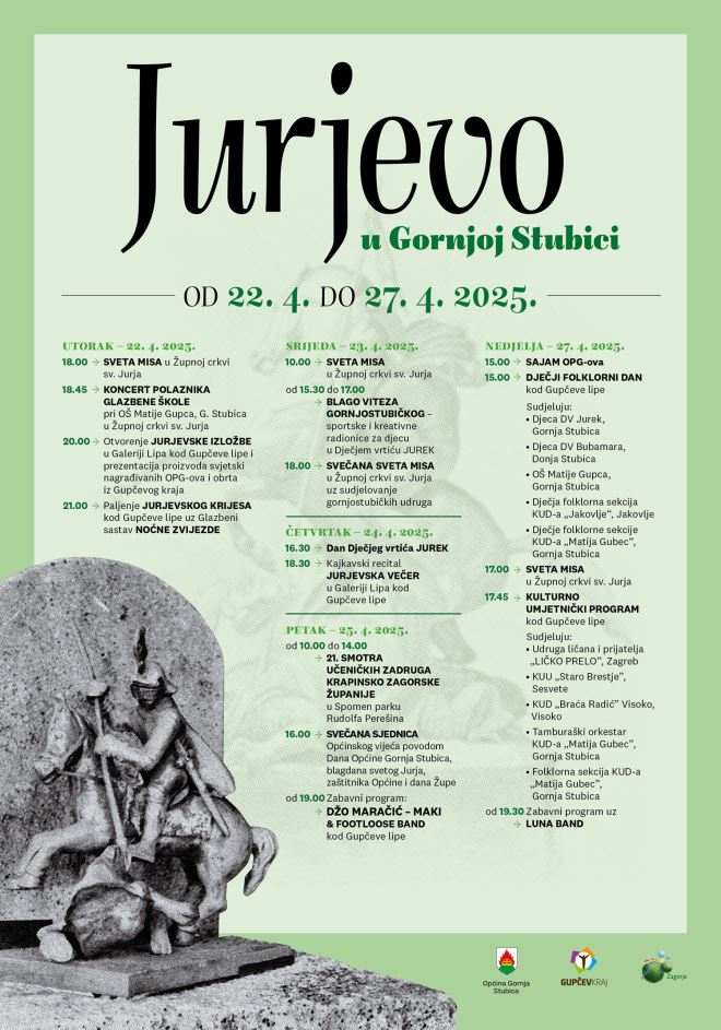 Od 22.4. do 27.4 obilježava se dan Općine Gornje Stubice uz proslavu Jurjeva. U sklopu Jurjeva, uz održavanje svečane sjednice, održat će se raznolik kulturno – umjetnički program. Otvara se tradicionalna Jurjevska izložba, prezentirat će se svjetski nagrađivani proizvođači s područja Gupčevog kraja, palit će se Jurjevski krijes, a nastupit će i domaće glazbene udruge te će se održati dječji folklorni dan, kao i koncert pod Gupčevom lipom. Organizator događanja je Općina Gornja Stubica s partnerima i lokalnim udrugama. U subotu, 26. travnja u parku Jure Stubičanca u Donjoj Stubici održat će se Sajam cvijeća od 8 do 14 sati, gdje ćete mići kupiti sadnice cvijeća, začinskog i ljekovitog bilja, zemlju za cvijeće i humus te bilje za vrt. Posjetitelji će moći uživati u cvjetnoj raskoši boja i mirisa. Cilj ovog sajma je potaknuti lokalno stanovništvo na uređenje svojih okućnica, balkona i dvorišta, a organizator događanja je Turistička zajednica.