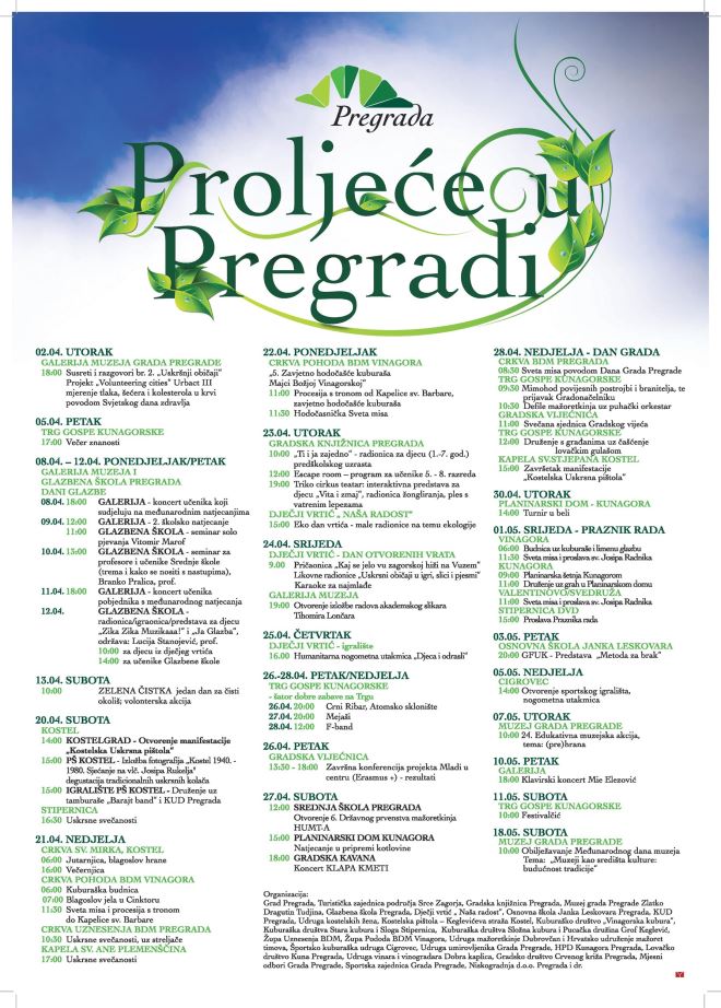 Krajem travnja i početkom svibnja družimo se na Kunagori jer Udruga umirovljenika organizira turnir u beli, a već tradicionalno 1. svibnja Praznik rada obilježava se planinarskom šetnjom i podjelom graha. Također, proslava sv. Josipa Radnika obilježit će se i na Vinagori, Valentinovu i Stipernici. I ove godine u Pregradu stiže GFUK i to s predstavom „Metoda za brak“, a u nedjelju 5. svibnja otvara se sportsko igralište u Cigrovcu. Osim toga, Muzej grada Pregrade u svibnju priprema edukativnu muzejsku akciju na temu prehrane, a također će nas posjetiti pijanistica Mia Elezović koja će nas počastiti klavirskim koncertom. Na Trgu Gospe Kunagorske u subotu 11. svibnja održat će se „Festivalčić“ u organizaciji OŠ Janka Leskovara, a program Proljeća u Pregradi završava obilježavanjem Međunarodnog dana muzeja u Muzeju grada Pregrade. - Pridružite nam se i ovog proljeća u Pregradi- poručuju organizatori.