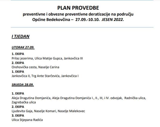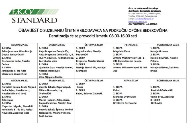 Provedba deratizacije na području općine Bedekovčina Autor: zagorje.com 27 rujna, 2022. 20:30 ispis Tweet Share on Facebook Plus on Google+ Općina Bedekovčina donijela je plan provedbe preventivne i obvezne preventivne deratizacije na području općine, koji će se provodiiti u razdoblju od 27.09. do 10.10.2022. godine prema planu: