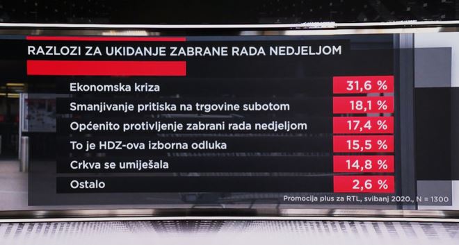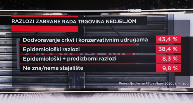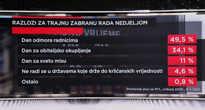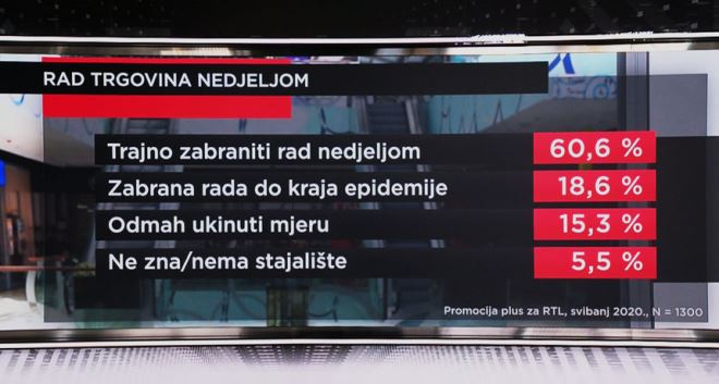 NAPOMENA: Istraživanje o zabrani rada nedjeljom za RTL je ekskluzivno provela agencija Promocija plus od 5. do 8. svibnja na 1300 ispitanika.