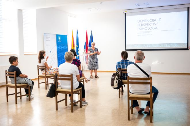 Još se jednim predavanjem i plesnom radionicom nastavljaju rujanske aktivnosti u sklopu projekta „Prevencija i liječenje demencije“. Predavanje pod nazivom „Demencija iz perspektive psihologa“ održala je klinička psihologica Gordana Kamenečki koja radi u Specijalnoj bolnici za medicinsku rehabilitaciju Krapinske Toplice na odjelu kardiološke rehabilitacije. Kroz ovo nadasve korisno i vrlo bitno predavanje, psihologica je ukratko pojasnila pojam demencije, čime je ova bolest uzrokovana, na koje se vrste može podijeliti te koji su sve stadiji ove bolesti. S obzirom kako oboljeli od demencije imaju poteškoća s kratkotrajnom memorijom, gube osjećaj za prostornu i vremensku orijentaciju, teško pronalaze adekvatne riječi, teže usvajaju nove sadržaje te, u kasnijim stadijima bolesti, trebaju pomoć drugih osoba u obavljaju svakodnevnih aktivnosti (hranjenje, održavanje osobne higijene, odijevanje, obavljanje nužde i sl.), psihologica je kroz ovo predavanje veliku pažnju posvetila praktičnim savjetima te preporučljivim smjernicama prilikom pristupanja osobi oboljeloj od demencije. Sudionici su imali priliku sudjelovati u kratkom zajedničkom testu znanja kroz kojeg se utvrdilo znanje o bolesti demencije te uvriježenim mišljenjima koja dolaze uz nju. Istaknuvši kako postoji razlika između demencije te pseudodemencije, odnosno „lažne demencije“ te kako se kojoj bolesti pristupa, psihologica je predavanje privela kraju.
