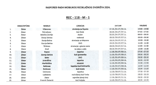 Komunalac Konjščina d.o.o. objavio je raspored rada mobilnog reciklažnog dvorišta za 2024. godinu. Raspored rada mobilnog reciklažnog dvorišta napravljen je na način da pokriva sva naselja na području JLS te da u svakom boravi po 30 minuta.