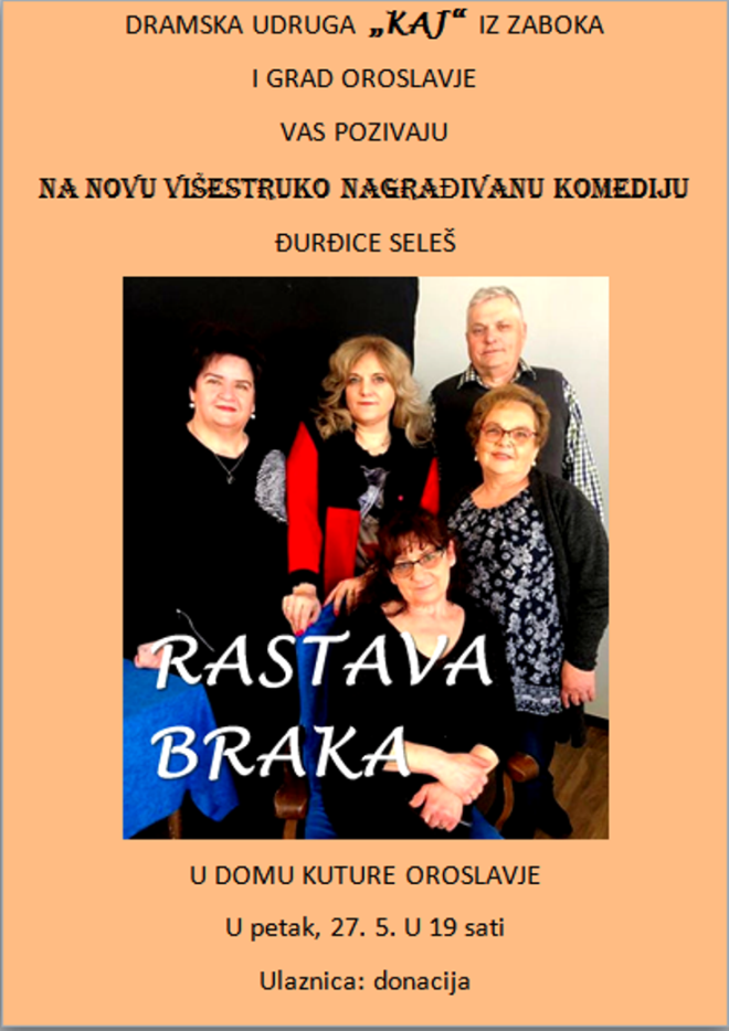 Dramska udruga „KAJ“ iz Zaboka i grad Oroslavje pozivaju vas na novu komediju Đurđice Seleš ''Rastava braka''.