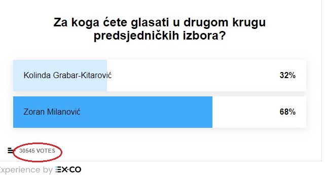 U drugi krug predsjedničkih izbora ušli su Zoran Milanović i Kolinda- Grabar Kitarović, a za to tko će biti predsjednik države glasat će građani 5. siječnja. Proveli smo anketu na našem portalu gdje su naši čitatelji anonimno mogli izjasniti za koga će glasati u drugom krugu. Oni su glasali od 29. prosinca od 11:10 do danas 2. siječnja u 10 sati. Glasalo je, a najviše glasova dobio je Zoran Milanović s 68 %, dok je Kolinda - Grabar-Kitarović dobila 32 % glasova.