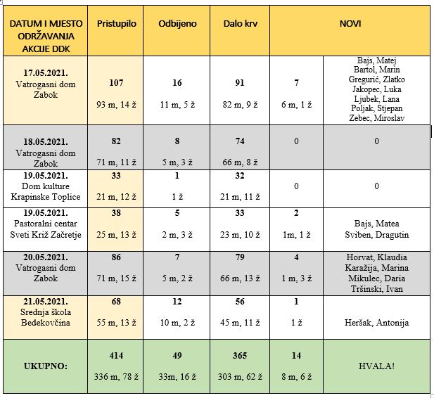 Gradsko društvo Crvenog križa Zabok objavilo je rezultatie svibanjskog ciklusa akcija DDK održanih od 17. do 21. svibnja 2021. godine u u organizaciji Gradskog društva Crvenog križa Zabok i Hrvatskog zavoda za transfuzijsku medicinu: