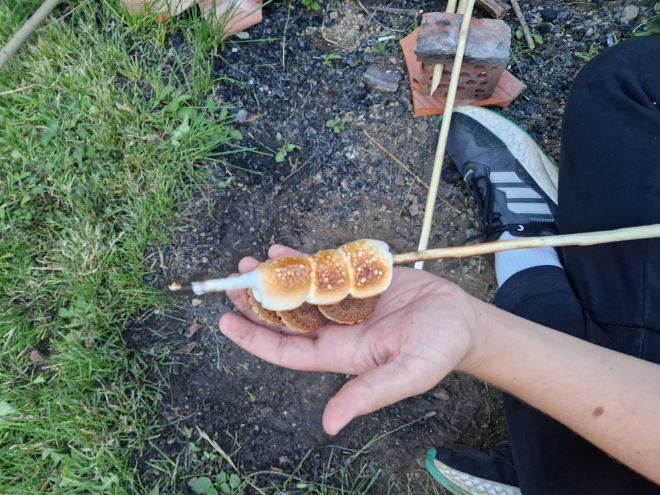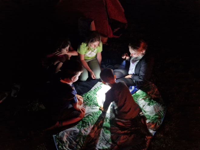 Večera je bila više nego ukusna ,uz hrenovke i jeger pekli su se i sljezovi kolačići. Nakon večere uz vatricu slijedila je priča o životinjama. Drugi dan na Majeru nakon doručka i igri sudionici su se uputili na ruševine Oštrca.
