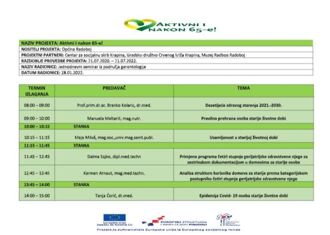U sklopu provedbe projekta Općine Radoboj „Aktivni i nakon 65-e!“, održat će se Jednodnevni seminar iz područja gerontologije u petak, 28. siječnja 2022. godine, s početkom u 8 sati u prostoru zgrade Dobrovoljnog vatrogasnog društva u Radoboju. Seminar je namijenjen zaposlenicima u sustavu socijalne skrbi.
