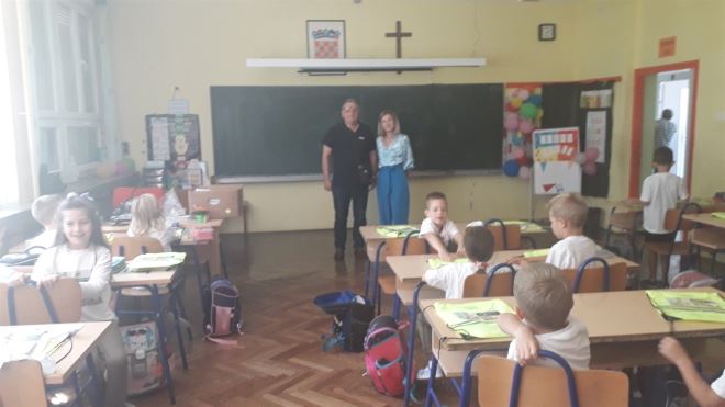 Učenicima su podijeljeni i prigodni pokloni, bijele majice i flourescentne ruksake s bojankama, slikovnicama i brošurama, koje je pripremio HAK.