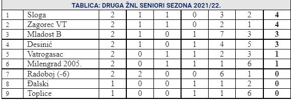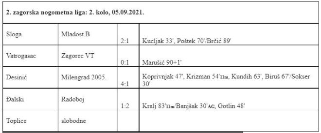 Nakon dva kola 2. zagorske nogometne lige jedina ekipa sa dvije pobjede je Radoboj, ali je na 0 bodova. Razlog je naravno kazna od minus 6 bodova, koju su u Radoboju brzo anulirali. U 2. kolu su svladali Đalski na svom terenu, ali nominalno kao gosti, jer je igralište u Gubaševom zasad izvan upotrebe. A vodstvo na ljestvici preuzela je Sloga, koja je sa 2:1 pobijedila Mladost B i sada ima 4 boda, kao i Zagorec VT, koji je u sučevoj nadoknadi odnio bodove iz Brezove. Na 3. mjestu je Mladost B sa 3 boda, koliko ima i Desinić, nakon što je u 2. kolu sa 4:1 pobijedio Milengrad 2005. Vatrogasac na 5. i Milengrad 2005. na 6. mjestu imaju po 1 bod, a Radoboj se popeo na 7. mjesto. Bez bodova su i Đalski i Toplice, koji su odigrali samo po jedan susret. U 3. kolu važna utakmica igra se u Belcu, gdje Mladost dočekuje Vatrogasac iz Brezove. Zagorec će u Velikom Trgovišću dočekati Desinić, a Toplice dočekuju Slogu. U Budinščini Milengrad 2005. je domaćin Đalskom, a slobodan je Radoboj. Utakmice se igraju u nedjelju 12. rujna u 17.00 sati.