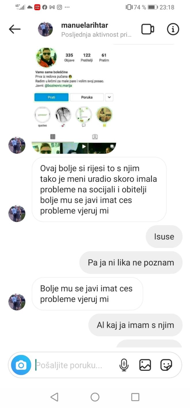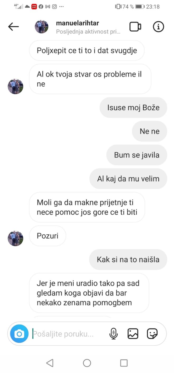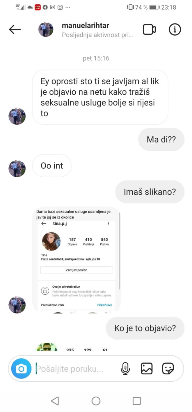 Dvije intelektualke, Valentina Pakračić Jambrek i Ivana Kotarski doživjele su jako neugodno iskustvo putem Instagrama, a nakon par dana kad su se oporavile od šoka dogovorile su se da se nemaju čega sramiti, ali javno govoreći mogu nekome pomoći. ‘Odlučile smo svemu stati na kraj ili bar pokušati, rekle su. Ispričale su kako su preko vikenda dobile neobičnu poruku. ‘Nakon prvotnog šoka, strah nas je natjeralo da se javimo i odgovorimo na poruku jer je stigla od žene s profila naizgled normalne i obiteljske žene. Ona je, kako je napisala samo htjela pomoći- pričaju nam. Naime, ta ih je žena obavijestila da je neki muškarac objavio njihove fotografije ukradene s profila i napisao oglas da žele ili nude seks. ‘ No, nedugo nakon njenih savjeta došle su poruke i s muškog profila.. On je tražio samo dvije fotografije u donjem rublju kako bi nas ostavio na miru. Strah i panika su nas obuzimale i pomalo je sve ličilo na neku zamku. Zamolile smo prijateljice da prijave profil muškarca, a ženu smo još malo istražile i.zaključile da je profil lažan, prijavile smo je, ali ‘ona’ još i danas ordinira i cijelo je vrijeme online. Ostalo možete zaključiti iz priloženih slika. Policija ne može puno, ali zato možemo mi možda barem ovako upozoriti druge žene i djevojke – kažu Valentina i Ivana. Naime, ukoliko nisu željele istog trena poslati dvije fotografije u donjem rublju, muškarac je prijetio da će oglas s fotografijama dijeliti svud okolo i socijalnim službama. U međuvremenu se javila žena iz početka priče I nagovarala ih da to učine kako bi ih on ostavio na miru. ‘To je jako neugodno, a osim toga kako objasniti primjerice suprugu da nisam ta koja je dala oglas, I ne samo njemu. Mi smo prijavile policiji, ali ako ona ništa ne može učiniti, želimo da barem čuju druge žene, a pogotovo majke djevojčica koje se možda boje tako nešto ispričati roditeljima, a tko zna do kud te ucjene, ničim izazvane, idu. Ispričale smo svoju priču u jednoj grupi i nevjerojatno, javile sun am stotine žena doslovno iz cijele Hrvatske s istim iskustvima. Neke su čak, da bi sakrile od ljudi što im se događa, muškarcu slale i novac – ispričale sun am Valentina i Ivana u nadi da će njihov glas doprijeti do nekoga i svojim svjedočenjem da će bar nekom pomoći.