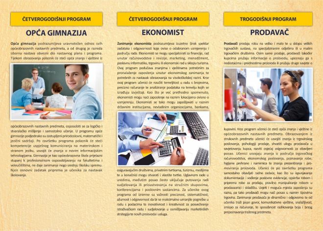 Nastava se odvija samo u jutarnjoj smjeni u suvremeno opremljenim učionicama i s primjenom novih tehnologija. S učenicima rade stručni i ambiciozni nastavnici. Svaki učenik prilikom upisa dobiva besplatno prijenosno računalo za olakšanu komunikaciju te mogućnost rada i učenja iz vlastitog doma. Time svima pružamo jednaku šansu i potrebne uvjete za učenje. Isto tako učenici imaju mogućnost organizirane prehrane i prijevoza, a organiziramo i besplatne pripreme za državnu maturu. Posvećujemo se svakom učeniku, nudimo mogućnost uključivanja u razne izvannastavne aktivnosti te u zanimljive fakultativne predmete. Također, u sklopu naše Škole djeluje i Centar izvrsnosti za komunikaciju koji je dobio certifikat „Europske točke darovitosti“.