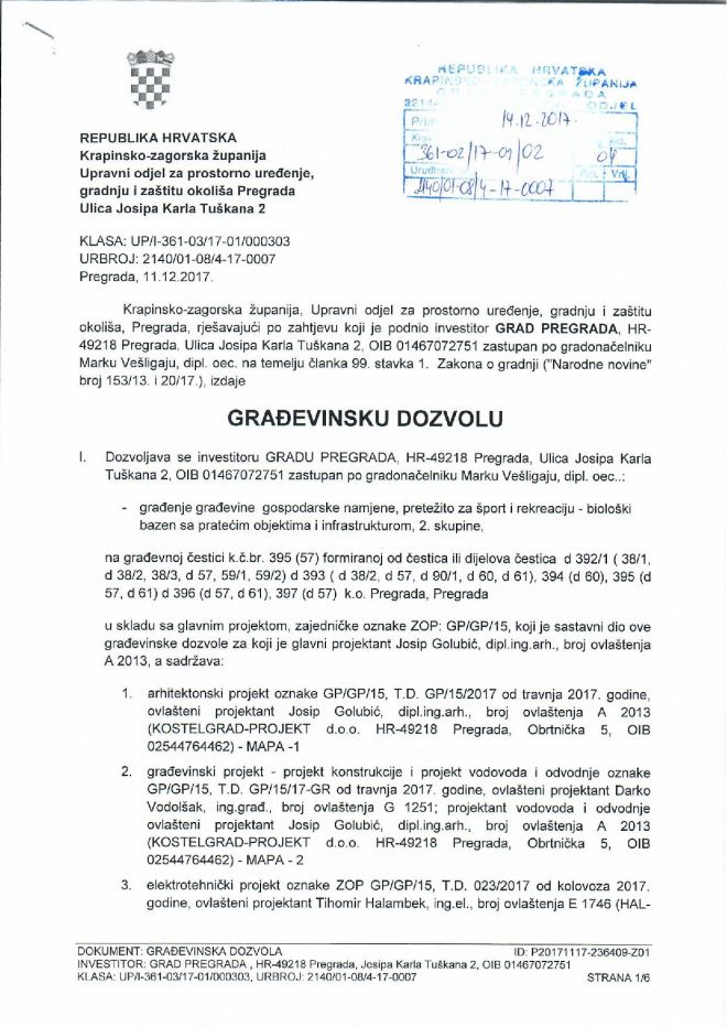 -Građevinska dozvola za izgradnju biološkog bazena s pratećim objektima i infrastrukturom izdana je 11.12.2017. od Krapinsko-zagorske županije, Upravnog odjela za prostorno uređenje, gradnju i zaštitu okoliša Pregrada. Trošak izrade projektne dokumentacije iznosio je 236.085,88 kuna, uz sufinanciranje Krapinsko-zagorske županije u iznosu od 50.000,00 kuna te tvrtke Kamgrad d.o.o. u iznosu od 50.000,00 kuna. Hrvatski telekom financirao je u cijelosti izvedene radove izmještanja telekomunikacijske infrastrukture s područja na kojem se planira gradnja bazena – rekao nam je gradonačelnik Marko Vešligaj te dodao kako projektna dokumentacija i građevinska dozvola predstavljaju preduvjet za prijavu projekta izgradnje biološkog bazena na natječaje za dodjelu bespovratnih sredstava.