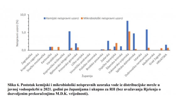 Pritom je 120 uzoraka (1,5 posto) bilo kemijski, a 54 (0,7 posto) mikrobiološki neispravno. Kada se izuzmu oni koji su uz valjana rješenja o dozvoljenom odstupanju ocijenjeni kao ispravni, neispravnih uzoraka u konačnici je bilo 139 (1,8 posto). Nakon toga poduzete su 'popravne radnje', najčešće čišćenje, ispiranje i/ili dezinfekcija kontaminiranih komponenti, upućuje HZJZ.