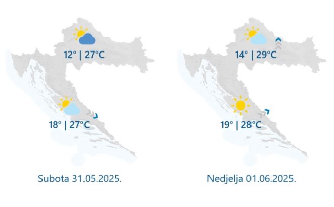 U unutrašnjosti će prevladavati djelomice do pretežno sunčano vrijeme. U subotu je moguć pokoji pljusak na istoku, a u nedjelju u Gorskoj Hrvatskoj. Vjetar većinom sjeverni i sjeverozapadni, a u nedjelju mjestimice južni i jugozapadni. Bit će postupno sve toplije, pa se u nedjelju očekuje vrlo toplo, ponegdje i vruće.