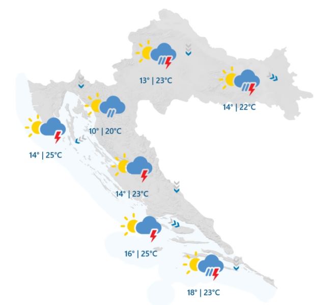 Danas će biti djelomice sunčano i nestabilno vrijeme. Uz promjenljivu naoblaku moguća je povremena kiša, a u drugom dijelu dana lokalno i pljuskovi s grmljavinom, ponajprije u unutrašnjosti zemlje. Puhat će umjeren sjeverni i sjeverozapadni vjetar, na istoku i u Dalmaciji prolazno i jak, a prema večeri će duž obale jačati bura. Najviša dnevna temperatura uglavnom između 20 i 25 °C, prognoza je DHMZ-a.
