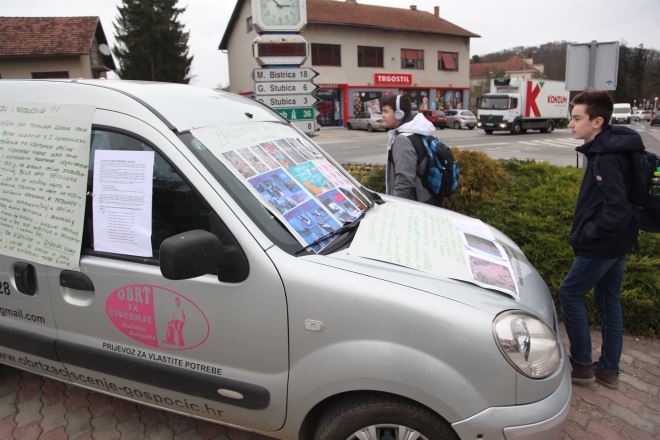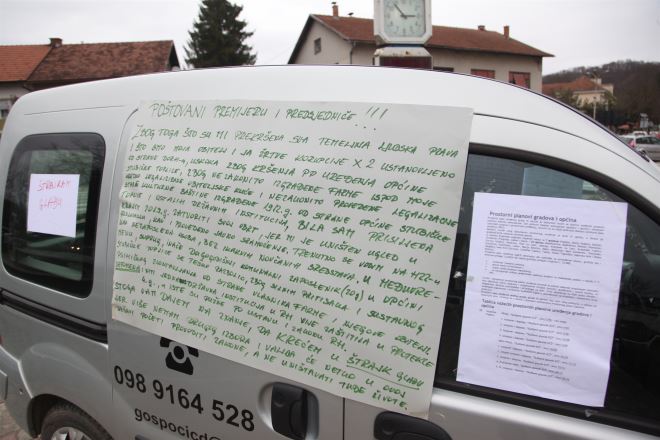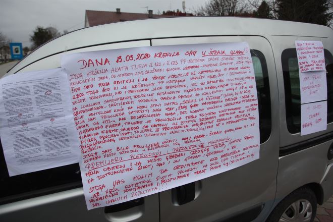 'Premijeru Plenkoviću i predsjedniče Milanoviću, moja obitelj i ja nismo građani drugog reda, imamo pravo na dostojanstven život, kao i svi građani i građanke u RH. Stoga vas molim da ordinirate kod nadležnih institucija, jer neću ostatak života provesti na sudu. Ova tiranija i nečovječno ponižavanje i postupanje traje punih 4 godine', stoji na jednom od plakata zalijepljenih na automobil.