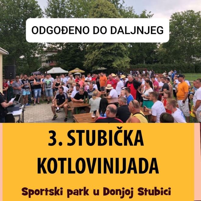 Ove nedjelje, 28. lipnja, u Donjoj Stubici trebala se je održati Stubička kotlovinijada, no na facebook stranici Grada stoji da se ona ipak neće održati te da se manifestacija odgađa do daljnjeg. Prenosimo objavu u cijelosti. - Nedjeljna događanja se odgađaju do nekih boljih vremena. Riskantno je okupiti 400-500 ljudi na jednom mjestu. Socijalnu distancu je nemoguće održati na ovakvom događaju. Nažalost ovo je jedino moguće i logično rješenje. Hvala svima što ste složili ekipe ali zdravlje nam mora biti prioritet prije svega. Družimo se uskoro, stoji na facebook stranici Grada Donja Stubica.