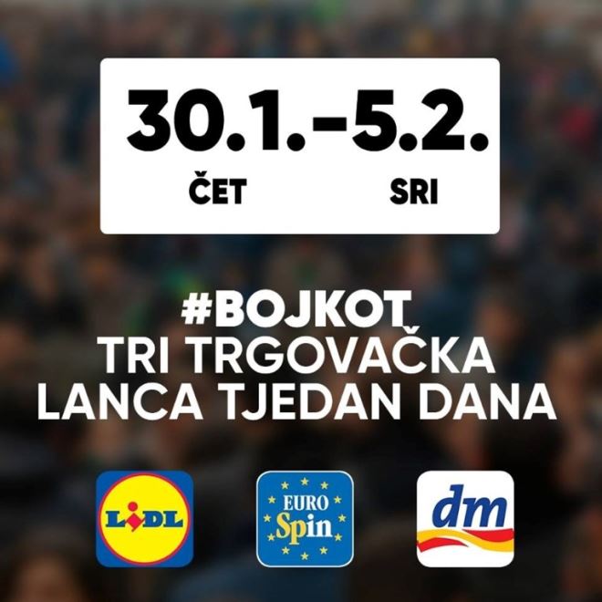 Platforma Halo, inspektore pozvala je na konferenciji za medije prekjučer na potpuni bojkot triju trgovačkih lanaca, i to od sutra ujutro do srijede uvečer. Predložili su da se Lidl, Eurospin i DM bojkotiraju na tjedan dana. Objavljene su i grafike koje bi trebale građanima olakšati praćenje bojkota.