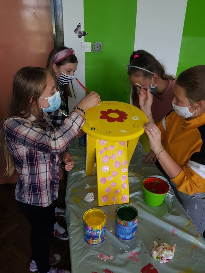 Prijedlog je da se nabave čvrste, ali lako prenosive stolice. . U akciji sudjeluju svi učenici predmetne nastave koji na satovima tehničke kulture vodootpornim bojama boje „stolčeke“. Svaki razredni odjel boji dva „stolčeka“, jedan djevojčice a drugi dječaci. Izbor motiva je po želji djece i međusobnom dogovoru. Tako smo dobili 22 vesela „stolčeka“ i možemo ih koristiti za nastavu na otvorenom. Djeca se vesele učionici na otvorenom koja je u petak, 23. 10. 2020. zahvaljujući lijepom sunčanom danu i proradila.