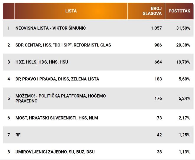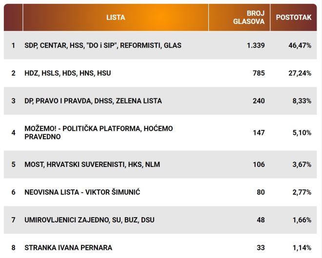 Ovo su rezultati prvih osam lista po broju osvojenih glasova u Oroslavju: