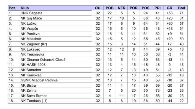 Danas se igra 33. kolo 3. NL centar. Kolo već u 14 sati otvaraju Gaj Mače i Lukavec. Pobjedom Gaj bi i teoretski osigurao drugo mjesto na kraju sezone, iza Segeste. Ostale utakmice igraju se u 18 sati. Zagorec KR dočekuje Dinamo OO i traži nastavak dobrog niza, kako bi još više učvrstio top 10 poziciju, jer u kolo ulazi sa sedmog mjesta. Tondach je pak domaćin Trešnjevci, a u kolo ulazi sa zadnjeg mjesta i novu će sezonu opet igrati 4. NL središte skupina A. Evi svih parova i aktualne ljestvice.