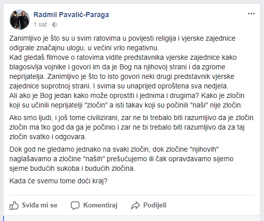 Pavalić u svojoj objavi postavlja niz zanimljivih i konkretnih pitanja na koje, nažalost, u subjektivnim emotivnim komentarima raznih 'fejs' komentatora ne nailazimo na odgovore. "Ako smo ljudi, i još tome civilizirani, zar ne bi trebalo biti razumljivo da je zločin zločin ma tko god da ga je počinio i zar ne bi trebalo biti razumljivo da za taj zločin svatko i odgovara", pita se Paraga.
